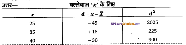 (ख) विचरण गुणांक बल्लेबाज ‘x की तुलना में y का अधिक है। अत: विश्वसनीयता के आधार पर y का चयन किया जाना चाहिए।