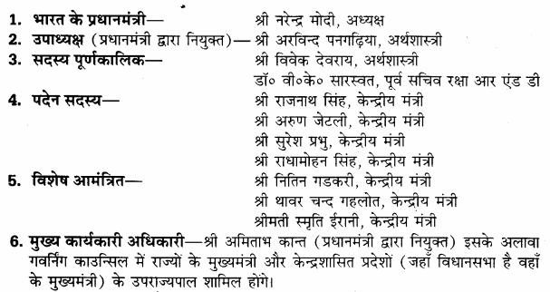 नीति आयोग की अधिशासी परिषद् (Goverming Council) में सभी राज्यों के मुख्यमंत्रियों तथा केन्द्रशासित क्षेत्रों के उपराज्यपालों को शामिल किया गया है। इस प्रकार नीति आयोग का स्वरूप योजना आयोग की तुलना में अधिक संघीय बनाया गया है। प्रधानमंत्री की अध्यक्षता वाले इस आयोग में एक उपाध्यक्ष व एक मुख्य कार्यकारी अधिकारी (Chief Executive Officer; CEO) का प्रावधान किया गया है। अमेरिका में स्थित कोलम्बिया विश्वविद्यालय में कार्यरत रहे। प्रो० अरविन्द पनगढ़िया को नवगठित आयोग का उपाध्यक्ष तथा योजना आयोग की सचिव रहीं सिंधुश्री खुल्लर को इसका प्रथम सीईओ (1 वर्ष के लिए) नियुक्त किया गया। इनके अलावा प्रसिद्ध अर्थशास्त्री विवेक देवराय व डी०आर०डी०ओ० के पूर्व प्रमुख वी०के० सारस्वत नीति आयोग के पूर्णकालिक सदस्य बनाए गए हैं जबकि 4 केन्द्रीय मन्त्री राजनाथ सिंह (गृह मंत्री), अरुण जेटली (वित्त एवं कॉर्पोरेट मामलों के मंत्री), सुरेश प्रभु (रेल मंत्री) तथा राधा मोहन सिंह (कृषि मंत्री) इस आयोग के पदेन सदस्य हैं। विशेष आमंत्रितों के रूप में तीन केन्द्रीय मन्त्रियों-नितिन गडकरी, स्मृति ईरानी व थावरचन्द गहलोत को इसमें शामिल किया गया है।