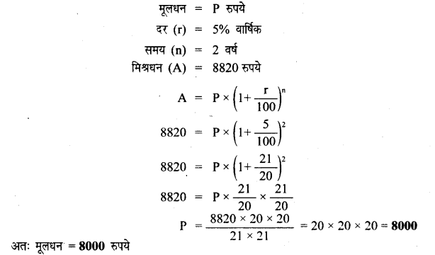 कोई धन 5% वार्षिक चक्रवृद्धि ब्याज की दर से 2 वर्ष में 8820 हो जाता है। तो मूलधल ज्ञात कीजिए।