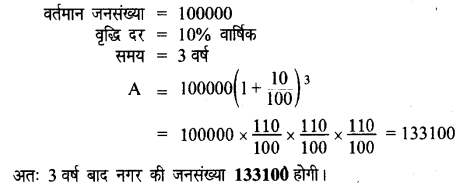 किसी नगर की वर्तमान जनसंख्या 100000 है। यदि रोजगार की उपलब्धता के कारण जनसंख्या 10% वार्षिक दर से बढ़े, तो 3 वर्ष बाद नगर की जनसंख्या कितनी होगी?