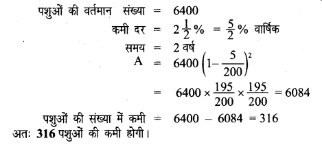 एक ग्राम पंचायत क्षेत्र में पशुओं की संख्या में 23[latex]\frac { 1 }{ 2 } [/latex]% प्रतिवर्ष की दर से कमी हो रही है। यदि वर्तमान में पशुओं की संख्या 6400 हो, तो 2 वर्ष बाद क्षेत्र में कितने पशुओं की कमी हो जाएगी?
