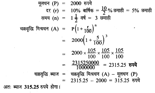 रु. 40960 का 12[latex]\frac { 1 }{ 2 } [/latex]% वार्षिक ब्याज की दर से 1[latex]\frac { 1 }{ 2 } [/latex] वर्ष का चक्रवृद्धि ब्याज ज्ञात कीजिए, जबकि ब्याज छमाही संयोजित होता है।